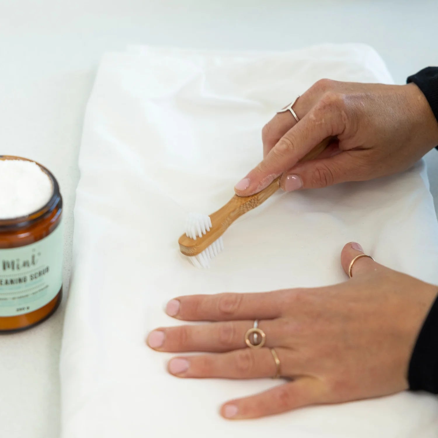 The Mint Cleaning Brush offers a sustainable, effective alternative to plastic brushes, crafted from 100% biodegradable bamboo with a custom Mint design. Its minimalist form features soft bristles that thoroughly clean a variety of surfaces, including grout, sinks, upholstery, clothing stains, stove tops, window sills, and more. The sturdy bamboo handle is comfortable to hold, making every cleaning task easier while supporting an eco-friendly lifestyle.
